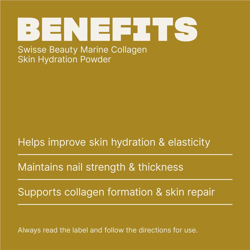 Swisse Beauty Marine Collagen Skin Hydration Unflavoured Powder is a beauty nutrition blend, formulated with sustainably sourced marine collagen peptides to help improve skin hydration and elasticity, vitamin C to support collagen formation, skin repair and help reduce free radical damage to body cells, and biotin to maintain nail strength and thickness, and support hair growth when dietary intake is inadequate.