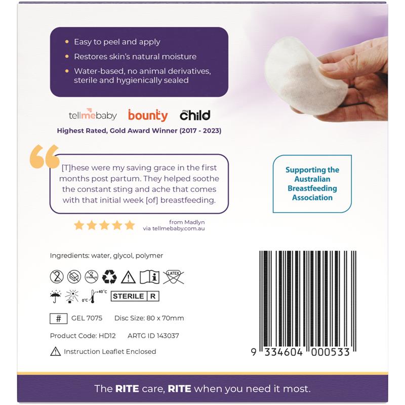 Rite Aid Hydrogel Breast Discs 12packs Rite Aid Hydrogel Breast Discs helps breastfeeding mum to continue ther breastfeeding journey by providing comfort to sore nipples. Our hydrogel breast discs aids to heal of broken skin and soothes the sore nipples. Packed in a sterule and hygienically sealed pouch. Suitable For: breastfeeding mums
