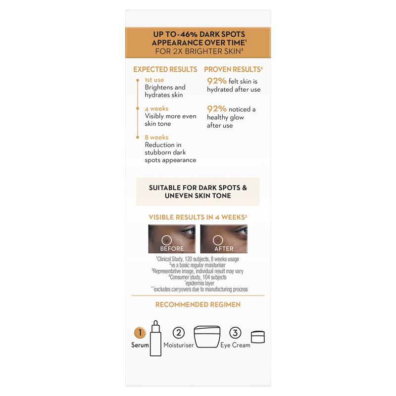 UP TO -46% DARK SPOTS APPEARANCE OVER TIME* FOR 2X BRIGHTER SKIN**BIOAVAILABLE INGREDIENTS^• ACTIVATED NIACINAMIDE penetrates 10 layers deep? to reveal skin’s even glow • STABLE & POTENT VITAMIN C helps reduce the appearance of spots and discoloration SUITABLE FOR DARK SPOTS & UNEVEN SKIN TONE• Lightweight• Fast-absorbing• Non-greasy texture EXPECTED RESULTS? 1st use: Brightens and hydrates skin? 4 weeks: Visibly more even skin tone? 8 weeks: Reduction in stubborn dark spots appearancePROVEN RESULTS^92% felt skin is hydrated after use92% noticed a healthy glow after useFORMULATED WITHOUT??Parabens, Phthalates, Petrolatum, Mineral Oils*Clinical Study, 120 subjects, 8 weeks usage**vs a basic regular moisturiser ^Refers to Niacinamide, Vitamin C, based on penetration up to epidermis layer ^^Consumer study, 104 subjects ?epidermis layer ??excludes carryovers due to manufacturing process#anti aging #brightening #Tone #Olay #serum #moisturiser #face moisturiser #eye cream #Cream #skin care #collagen #retinol #vitamin c #niacinamide #aha #hyaluronic Size: 30 ML
