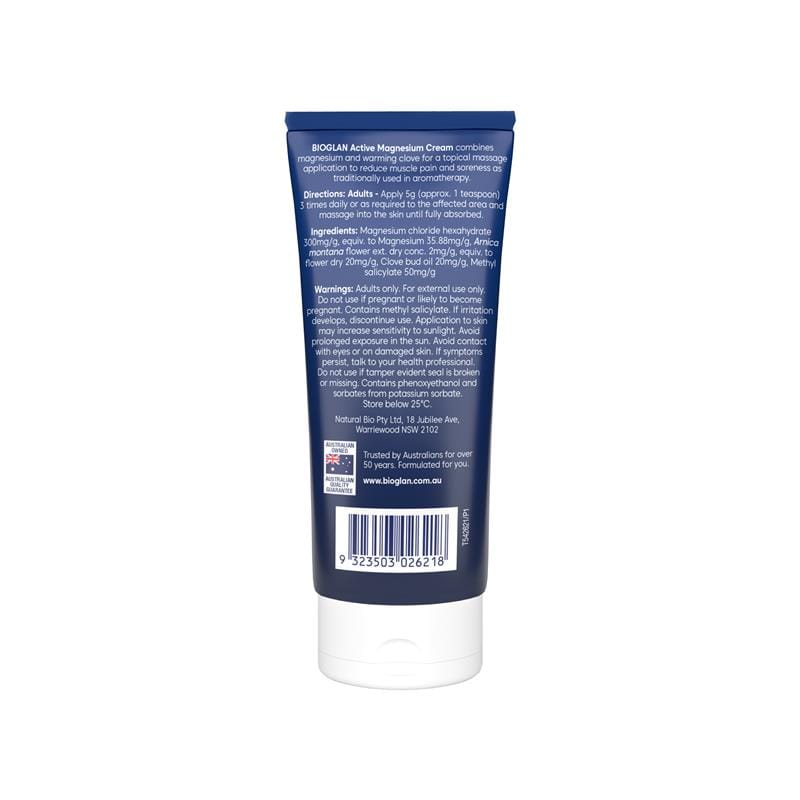 BIOGLAN Active Magnesium Cream contains a unique blend of magnesium, clove bud oil and the herb Arnica Montana. Ingredients traditionally used in aromatherapy to help reduce muscle pain and soreness.
