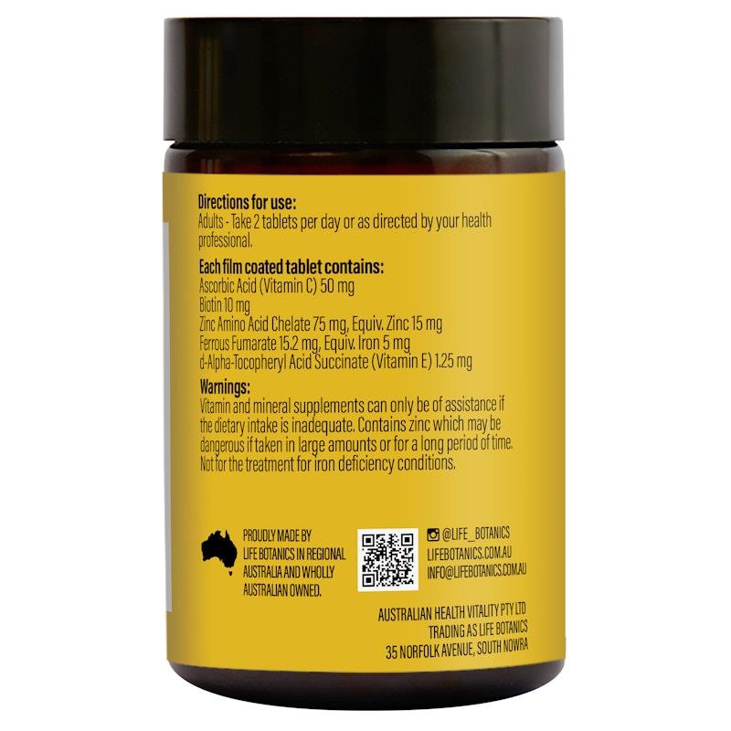 Each film-coated tablet contains: Ascorbic Acid (Vitamin C) 50mg Biotin 10mg Zinc Amino Acid Chelate 75mg, Equiv. Zinc 15mg Ferrous Fumarate 15.2mg, Equiv. Iron 5mg d-Alpha-Tocopheryl Acid Succinate (Vitamin E) 1.25mg