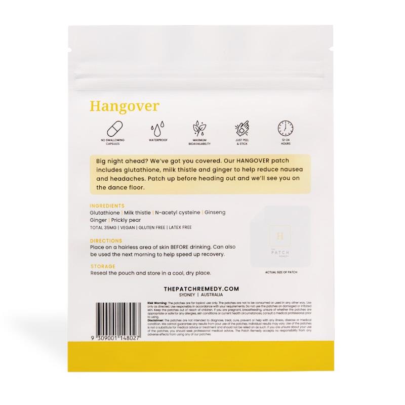The HANGOVER patch is packed full of powerful antioxidants and anti-inflammatories to help avoid headaches, nausea and tiredness after a night out. Containing glutathione and milk thistle, our hangover cure patch will have you detoxing while you drink.