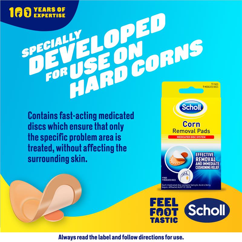 Scholl Corn Removal Pads are especially developed for use on hard corns. Contains fast acting medicated discs which ensure that only the specific problem area is treated, without affecting the surroudning skin.