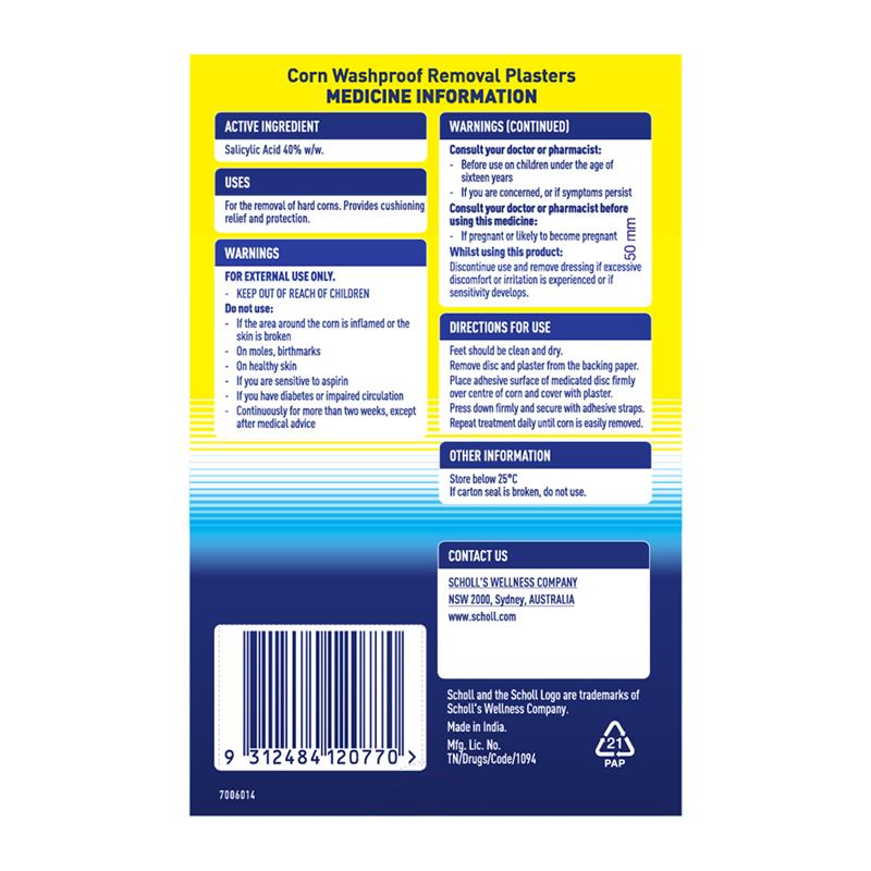 Scholl Corn Removal Plasters Washproof medicated disc system for effective corn removal and immediate cushioning relief.