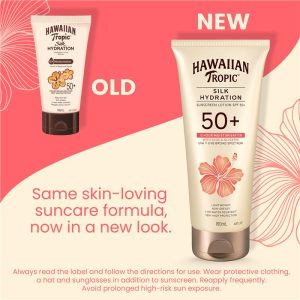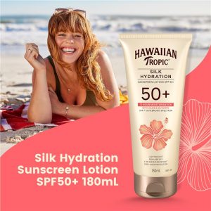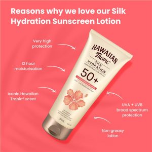Hawaiian Tropic® Silk Hydration Sunscreen Lotion SPF50+ lightweight formula provides very high UVA+UVB protection with 12 hour moisturisation.