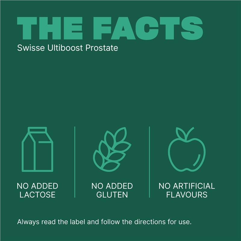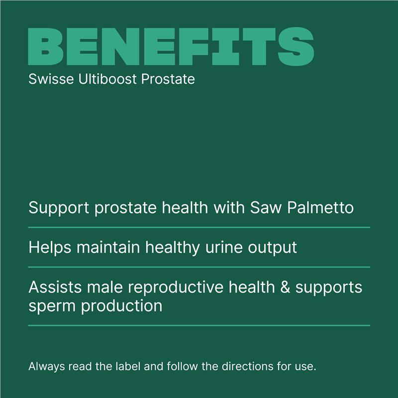 Swisse Ultiboost Prostate is an advanced formula for maintaining prostate health and support healthy prostate function. Formulated with natural ingredients such as saw palmetto and nettle root that maintain healthy prostate function and help to relieve nighttime urinary frequency and support prostate health. It contains zinc and selenium that support sperm production and maintains male reproductive system health. It also contains selenium that helps to reduce free radicals in the body., It’s an alternative approach containing zinc, vitamin D, turmeric and selenium. Consider Swisse Ultiboost Prostate for comprehensive, support tailored to specific health goals. Suitable For: Vegetarians