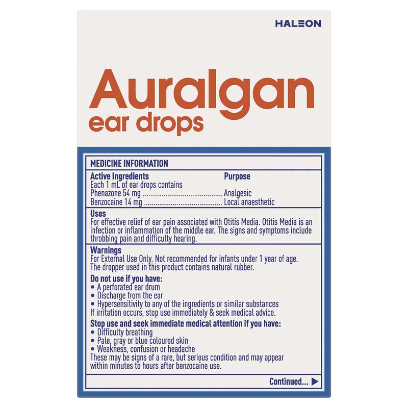 Auralgan Ear Drops is specifically formulated with Benzocaine, a local anaesthetic and Phenazone, an analgesic to provide effective relief of the pain associated with Otitis Media. Suitable For: Auralgan Ear Drops is ideal for effective relief of ear pain