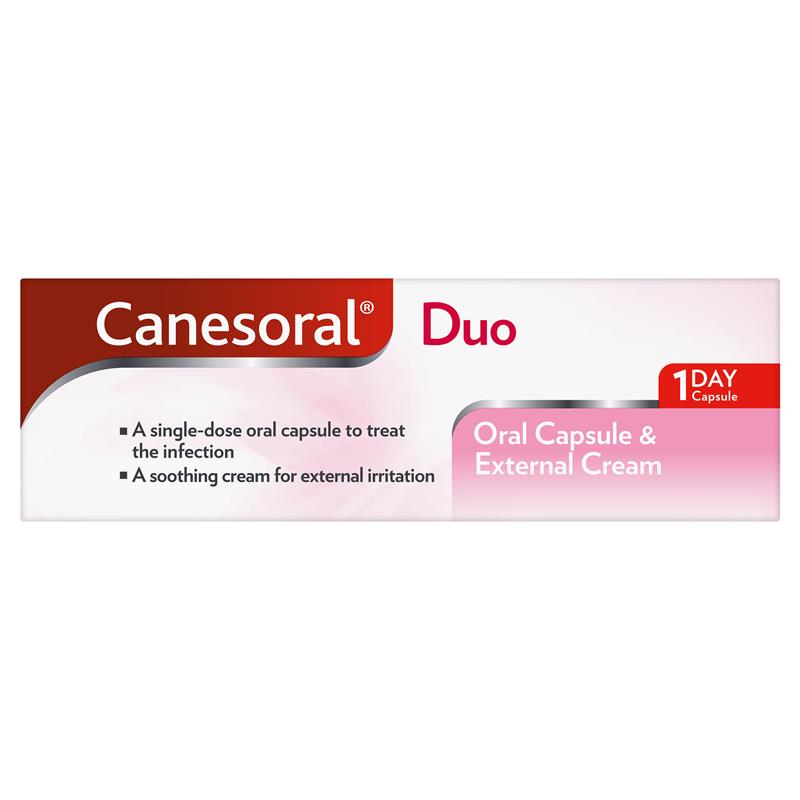 Canesoral Duo contains a single-dose oral capsule to treat vaginal thrush and a anti-fungal cream for the relief of external symptoms.